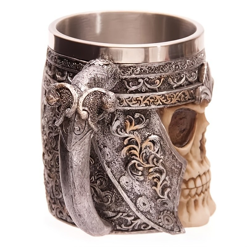 1pc Skull Knight Mug, Stainless Steel Viking Skull Mug, Creative Skeleton Beer Mug, Metal Skull Coffee Mug, Funny Gift, Home Kitchen Supplies
