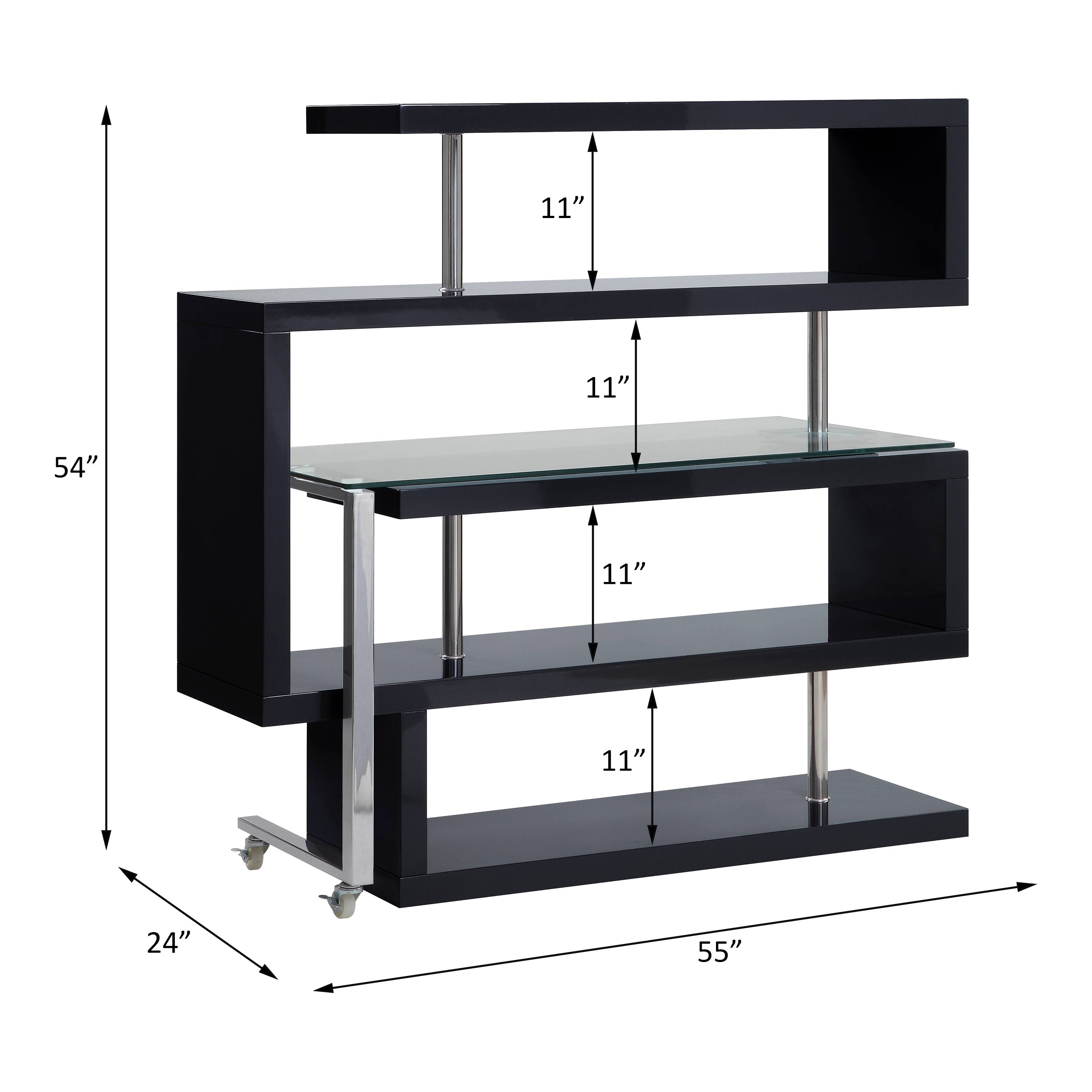 RomanceDesigned for space-conscious, the Raceloma writing desk with shelves is excellent for those with smaller spaces. The winding S-shaped shelf bookcase instantly transforms any room giving your books and decor a vibrant stage for display. Adding function to the design with a convenient roll-out desk with a sleek glass top, use it as an extra shelf on the bookcase when not in use. This desk makes for a contemporary multi-purpose piece in smaller spaces.Product Details•KD•Writing Desk w/Swivel Function•Open Storage: 4 Shelves•High Gloss Finish•Metal Table Base•Shelf Thickness: 2"•Glass Thickness: 10 mm•Tempered Glass