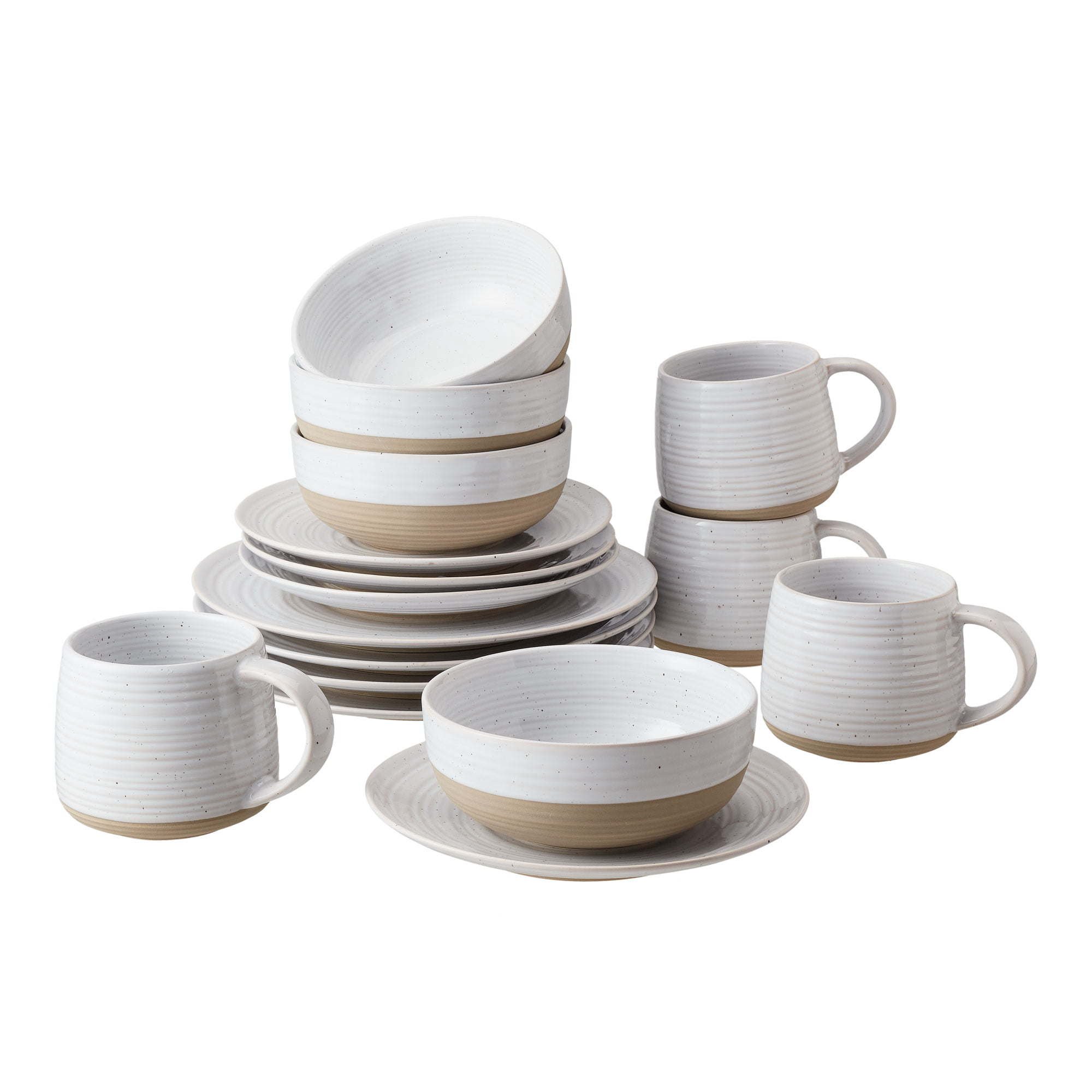 The Better Homes & Gardens Abbott Stoneware 16 Piece Dinnerware Set adds a warm, modern sophistication to all of your dinnertime gatherings. Crafted with high-quality, durable stoneware, this dinnerware collection features delicate speckles and exposed clay details that exude rustic charm. The contrast between the shiny, glazed stone and matte, exposed clay creates an artisanal flair that elevates any dining experience. Designed in beloved neutral tones, this set easily complements just about any home decor style. Layout your favorite cutlery and tablecloth, and let the Better Homes & Gardens Abbott Stoneware Set do the rest. Offering service for four, this stoneware set includes four dinner plates, four salad plates, four dinner bowls, and four mugs. Each piece is dishwasher and microwave safe, so after-dinner cleanup and reheating leftovers is a breeze - it doesn't get any better than that.
