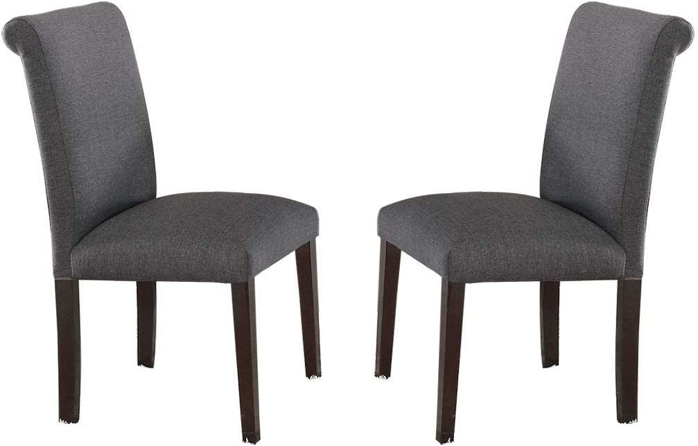 Simplicity dining is defined by this casual dining set with seating for six. Each Parson styled chair features upholstered frame with stud trim and brown leg supports.