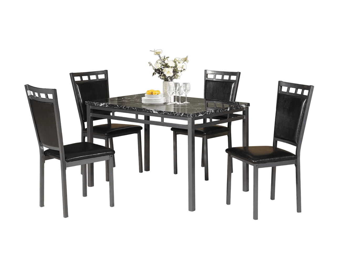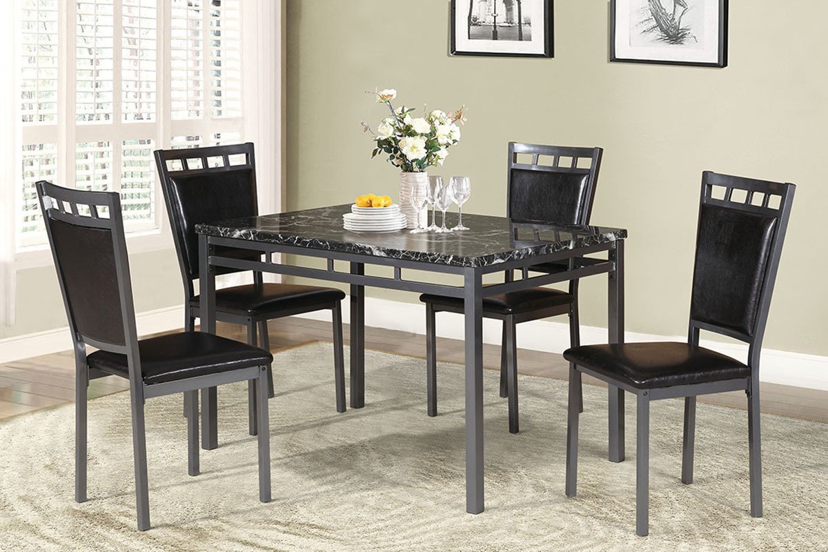 Product DescriptionProduct Description:-Light up for home dining space with a 5-piece dining set that works both in a classic or modern setting. It features a faux marble finished tabletop and Espresso upholstered chairs, comfortably seating four.Product Dimensions:-Dining Table: 48" x 30" x 30"HSide Chair: 18" x 22" x 38"HListing Includes :- Dining Table And 4x Side Chairs Only.Simple assembly require.Product Features:-•Contemporary Style•Espresso PU Upholstered•Cushioned Seats•Faux Marble Table Top•Metal Frame Base•Faux Marble•MDF w/ Paper veneer•FR foam