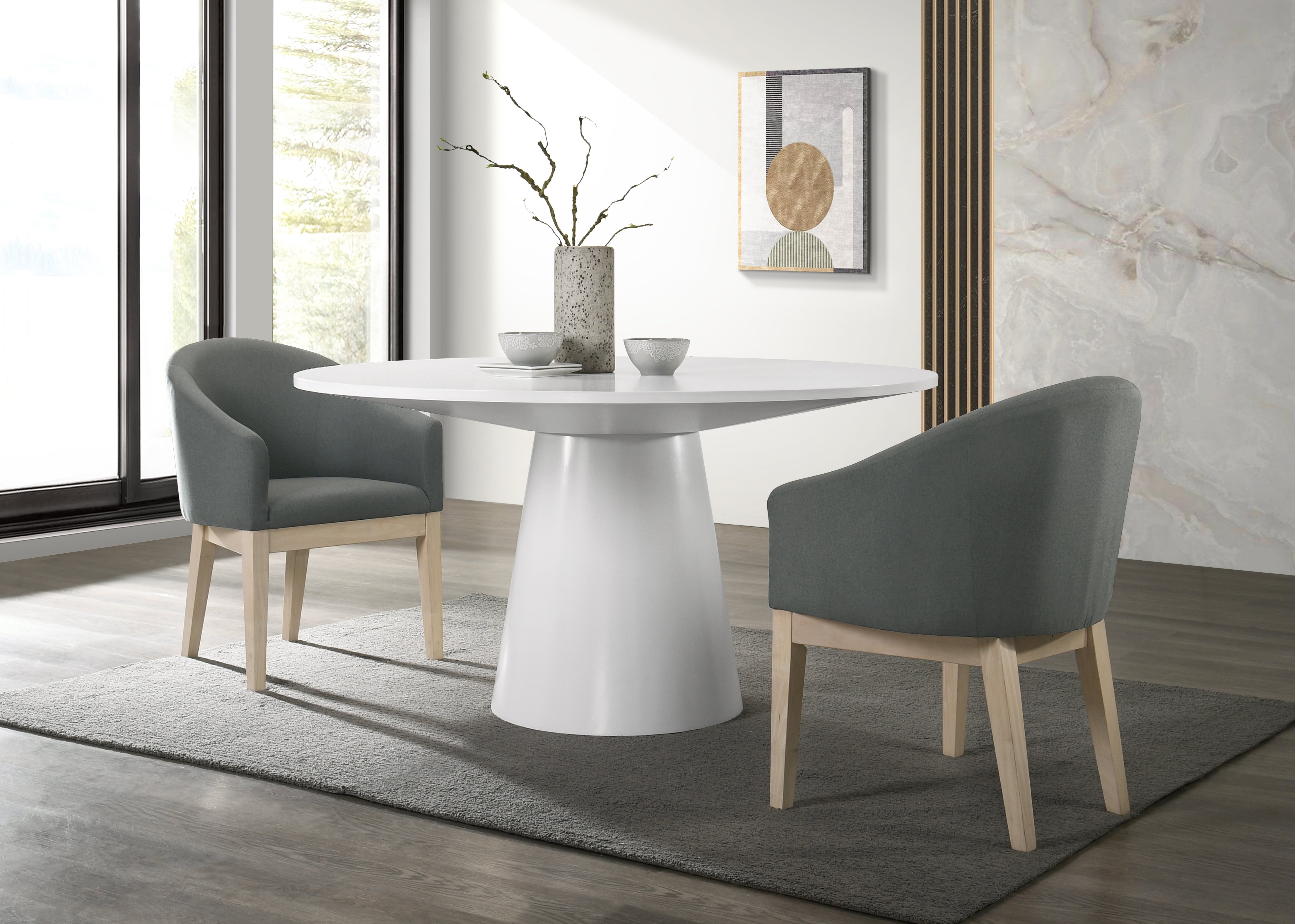 Looking to elevate your dining space? This 3-piece table and chair set from the Jasper collection will bring a sleek and modern style to your dining experience. The all round, pedestal base dining table and barrel chair set is the perfect center piece for your dining room.