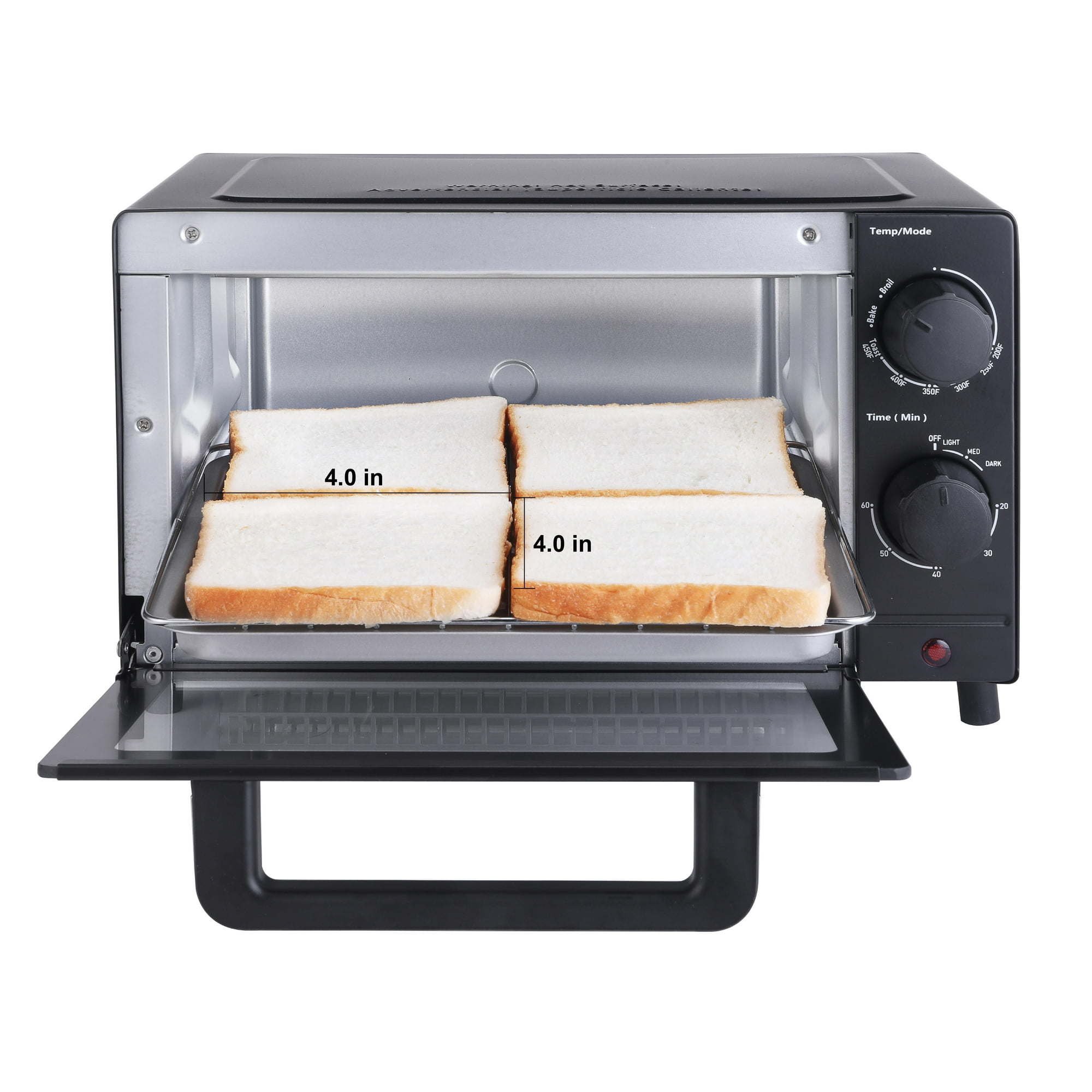 The Mainstays 4 slice Toaster Oven (MS54100112163) make your live more convenient and efficient. Perfect for preparing toast, sandwiches, pizza and much more. The Mainstays Toaster Oven can accommodate up to 4 slices of bread or a 9-inch pizza. The turn dial allows you to easily adjust the temperature mode and time settings. The compact size uses less energy and counter space and stores easily. Makes mealtime swift and smooth, especially in busy households. The sleek black finish will coordinate beautifully with existing kitchen decor and color palettes. Comes with baking rack and baking pan, simply wipe clean the oven exterior for quick and easy cleaning. Mainstays Toaster Oven is sure to become a staple in your home cooking and baking ventures, bring new experience in your daily life.