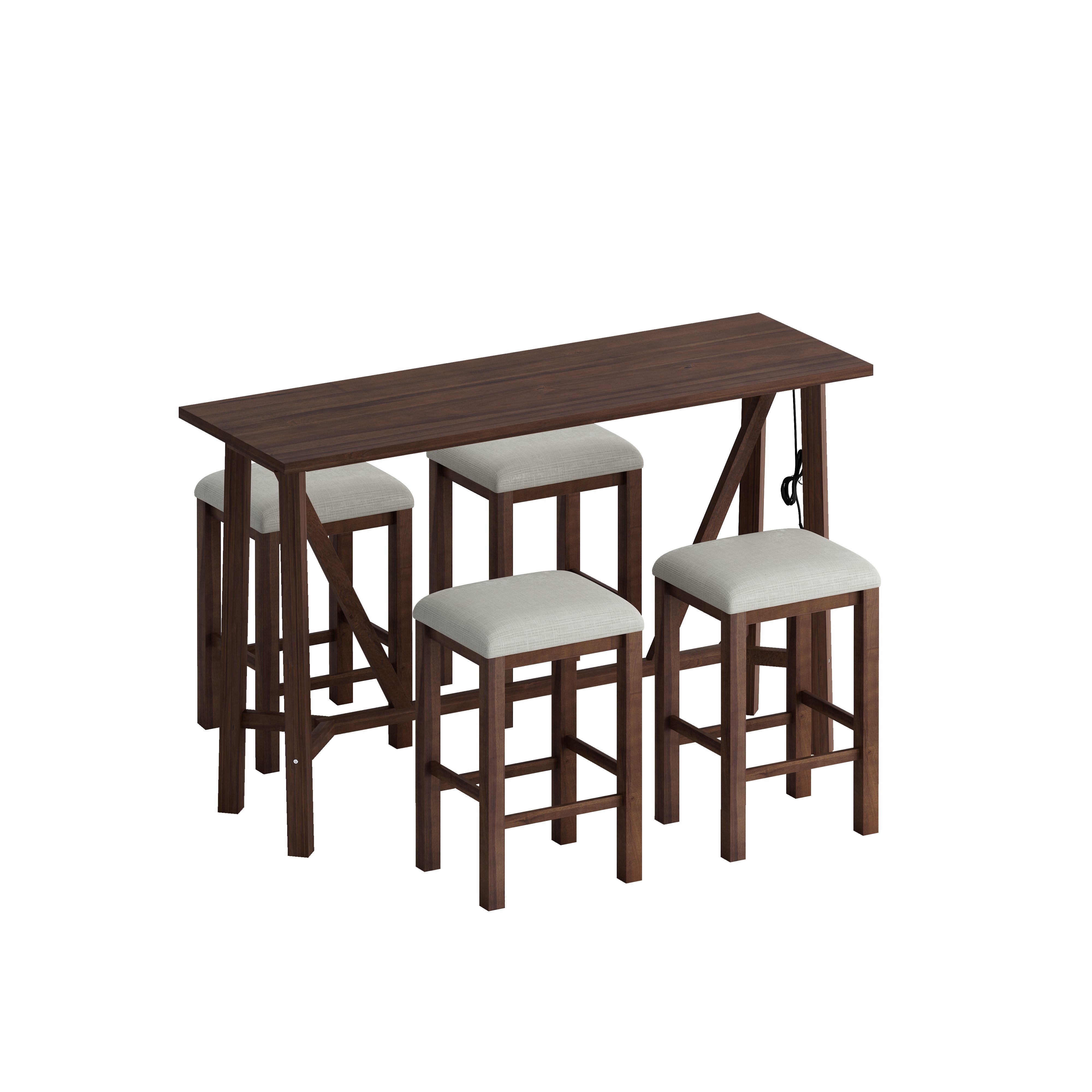 Features:Experience the perfect blend of style, convenience, and durability with this 5-piece dining table set. Add a touch of elegance to your dining area while enjoying the practicality of a built-in power outlet.The combination of the sturdy rubberwood legs and the stylish linen fabric seat cushions creates a captivating visual contrast, adding a touch of sophistication to your home decor.With its sturdy construction and splayed feet design, this dining table set ensures stability and durability for long-lasting use.Whether it's a cozy dinner for two or a small gathering of friends, this dining set is the perfect choice. Don't miss out on this opportunity to enhance your dining experience.Product Weight & Dimensions Specifications:Product Name5-Piece Dining Table Set with Power OutletsColorWalnut Table+Beige StoolMaterialTable: MDF Panel+Rubberwood LegsStool: rubber wood+Linen cover+foamPackage Number1Product Dimensions/WeightTable:59"L x 19.30"W x 36"H, 54.01 lbsStool:15.80"L x 12.60"W x 24.60"H, 11.90 lbs/piecePackage Dimensions62.99"Lx22.83"Wx9.45"HOverall WeightNet Weight: 110.23 lbs Gross Weight: 119.05 lbsWeight CapacityTable:350 lbsStool: 250 lbsAssembly RequiredYesAdditional Tools RequiredAll tools includedNotice1.Real Product's Color may be a little different from the image due to the lighting or monitor's display.2.Manual measurement has been used, there may be some reasonable error.Assembly NoticePlease read assemble manual in advance. Please do not over-tighten nuts, as this may cause distortion or breakage.