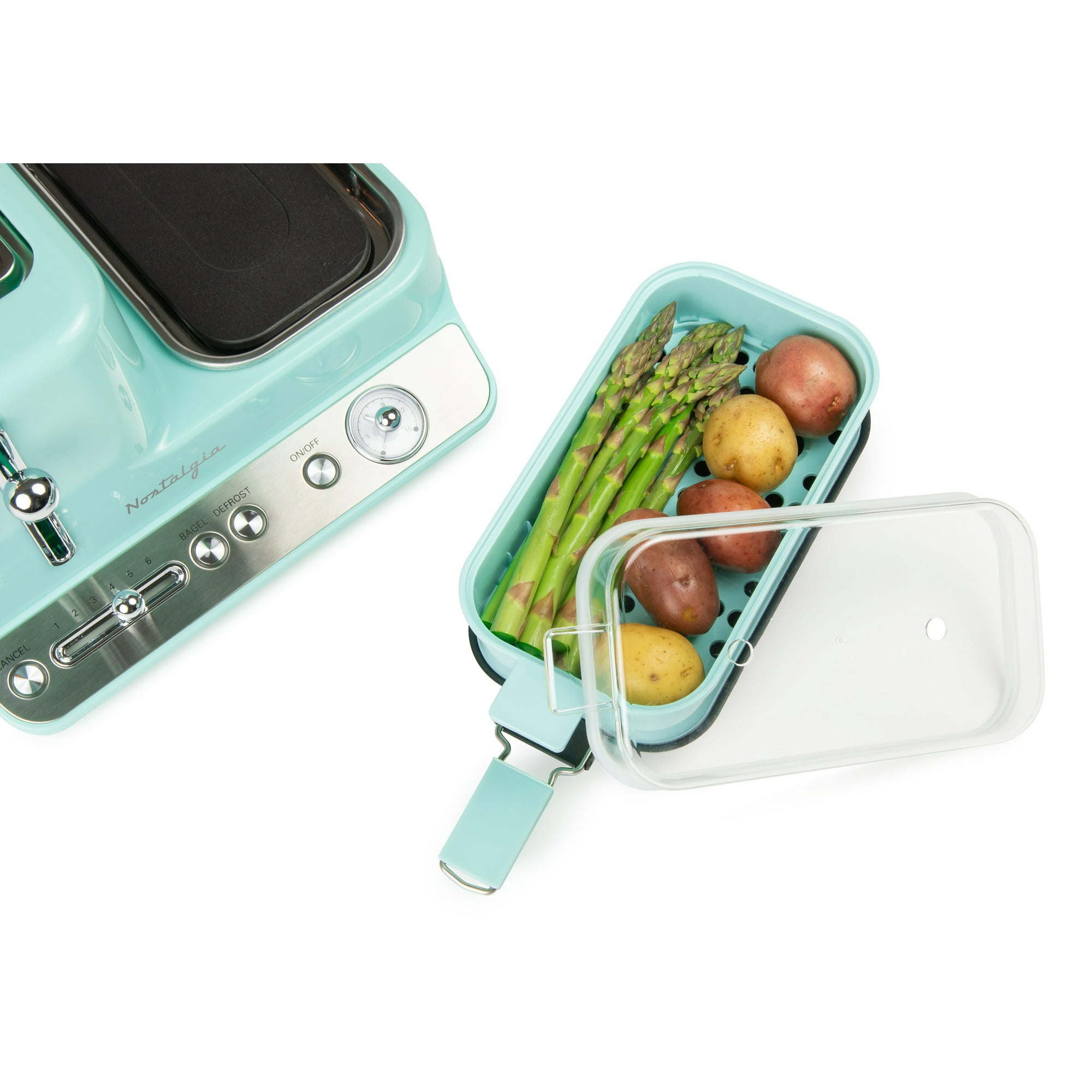 CLASSIC RETRO DESIGN: The classic retro styling with chrome accents the aqua beautifully, while the LED lighted control panel features chrome dials for toasting and a timer gauge for the egg cooker steamer and griddle. The alarm will sound once the timer runs down