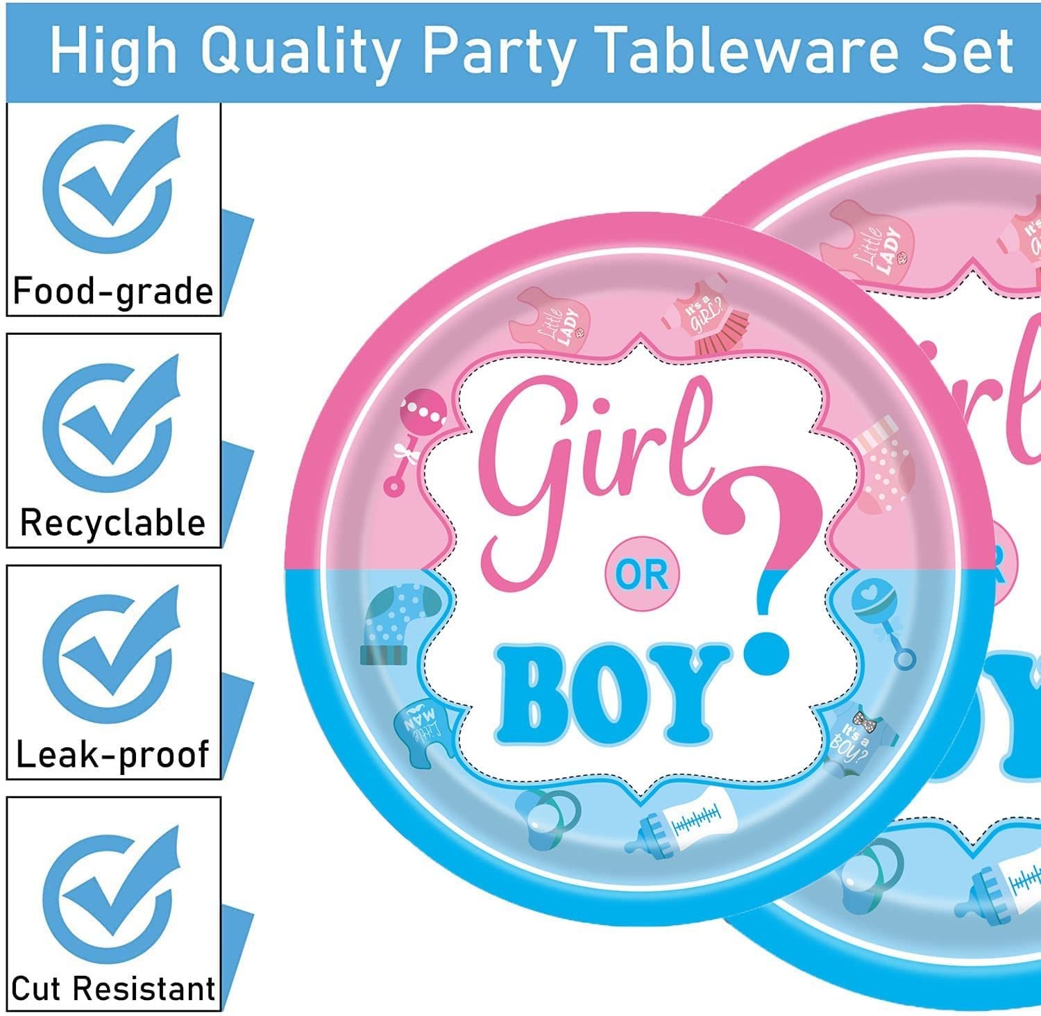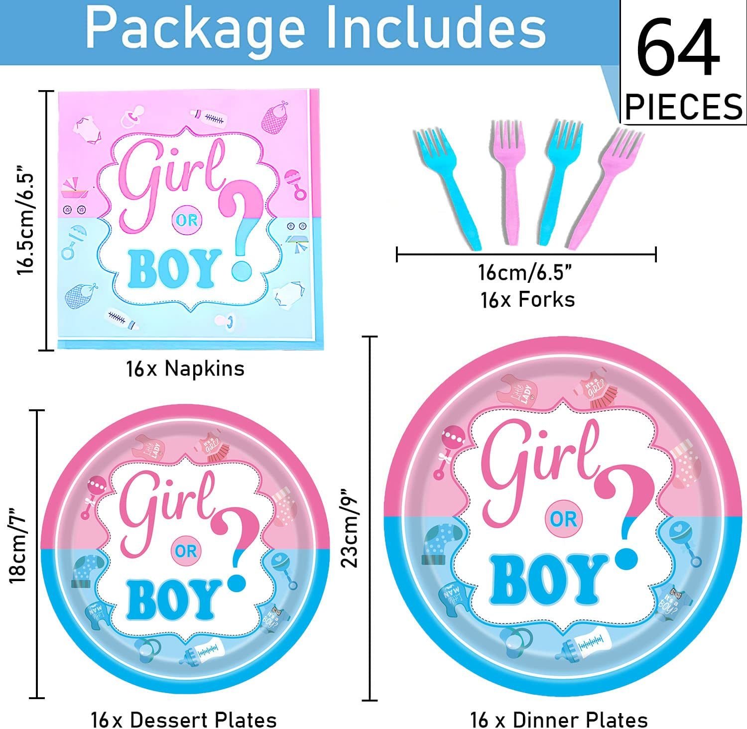 Wanna to host a fabulous gender reveal baby shower with your family or friends? Here we provide complete unique gender reveal party supplies tableware kit that your guests are sure to love!p /P Will it be boy or girl? Using this gender reveal kit to create a mood to celebrate, and then share good news with all you loved ones. Everyone will be impressed by these cute gender reveal table decorations..p /P The gender reveal plates for birthday party are made of environmental protection material, it can can guarantee the environment and your health.p /P Premium quality cute gender reveal birthday party plates,stability and durability,no need to worry about flimsy bends and leaks.p /P Disposable gender reveal party tableware set,easy to clean up after the party,save more time to enjoy your party!p /P Well made cute design girl or boy party plates napkins and plates set, perfect for your dinosaur birthday party table decorations or baby shower,first birthday party,picnics,Christmas,get-togethers,outdoor events and more.p /P Girl or boy pattern dinnerware set made of high-end, durable and heavyweight paperp /P 16 servings of the following items are included in this bundle:p /P 16 pcs Gender Reveal Dinner Plates (9 inch)"br 16 pcs Gender Reveal Paper Dessert Plates (7 inch)br16 pcs Gender Reveal Napkinsbr 16 pcs Disposable Plastic Forksp /P Note: Please don't microwave the plates and napkins