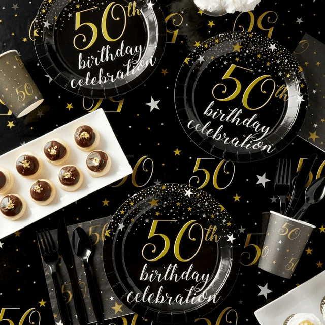 50th birthday party supplies: our black disposable tableware set features stars and "50th birthday celebration" in gold lettering; ideal for "50 & fabulous," "Cheers to 50 years," or over the hill party supplies for women and men
