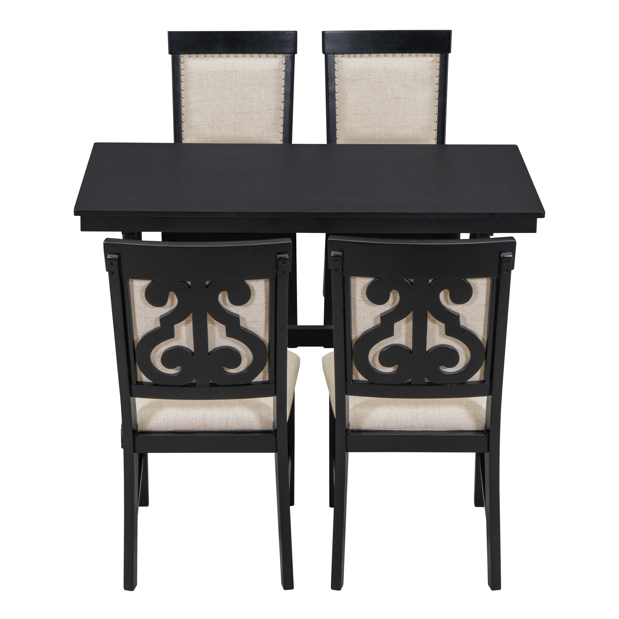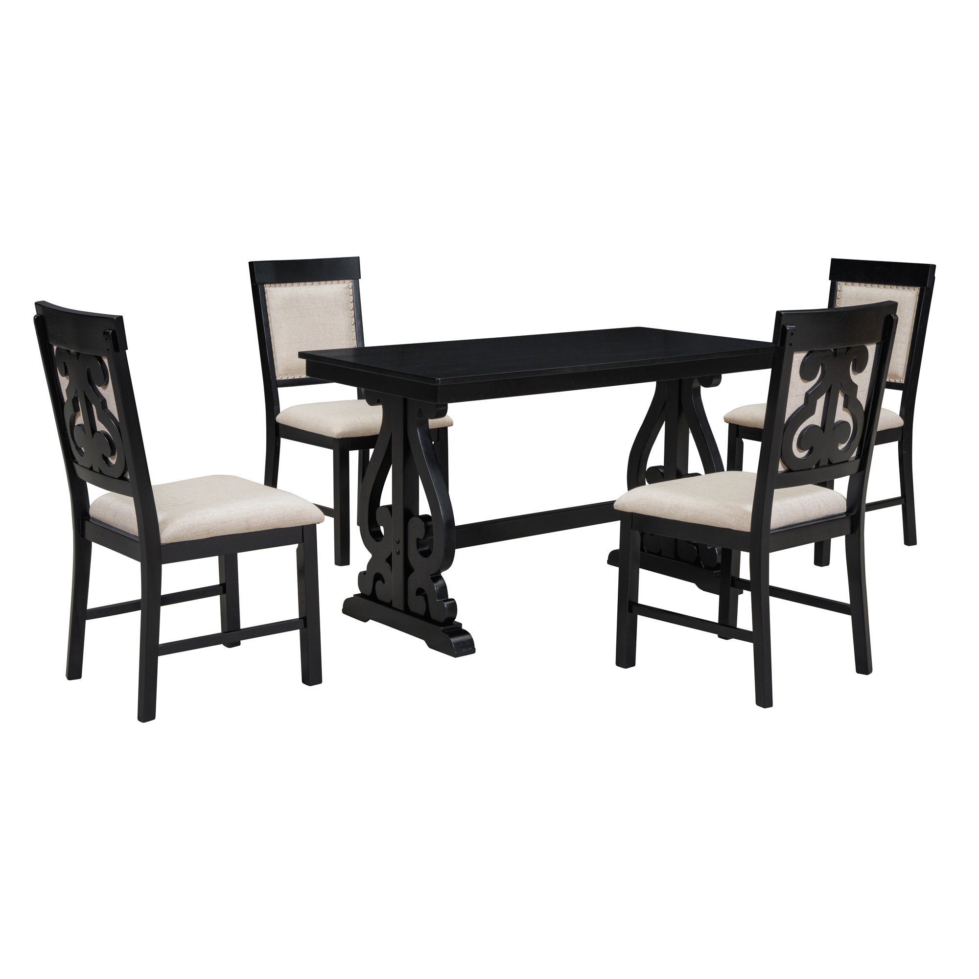 Retro StyleThe retro dining set comprises one dining table and four matching upholstered chairs, blending understated elegance with a rich vintage feel. The table legs and backrests of the chairs feature symmetrical hollowed-out carving patterns. It's available in two colors, black and brown and white. No matter which color dining set you choose, it will be the crowning touch of your restaurant.