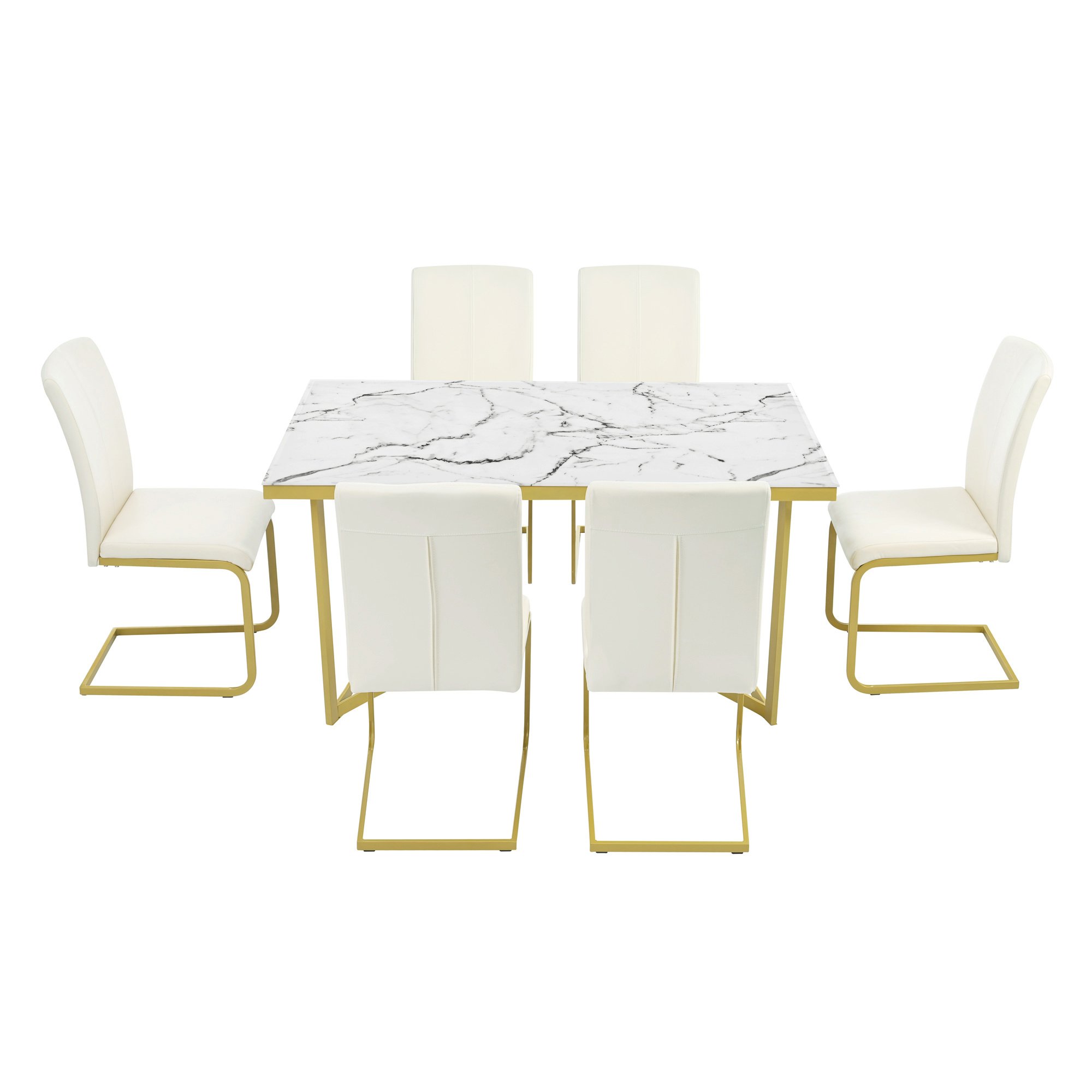 TREXM 7-Piece Modern Dining Table Set, Rectangular Marble Sticker Table and 6 PU Leather Chairs with Golden Steel Pipe Legs for Dining Room and Kitche