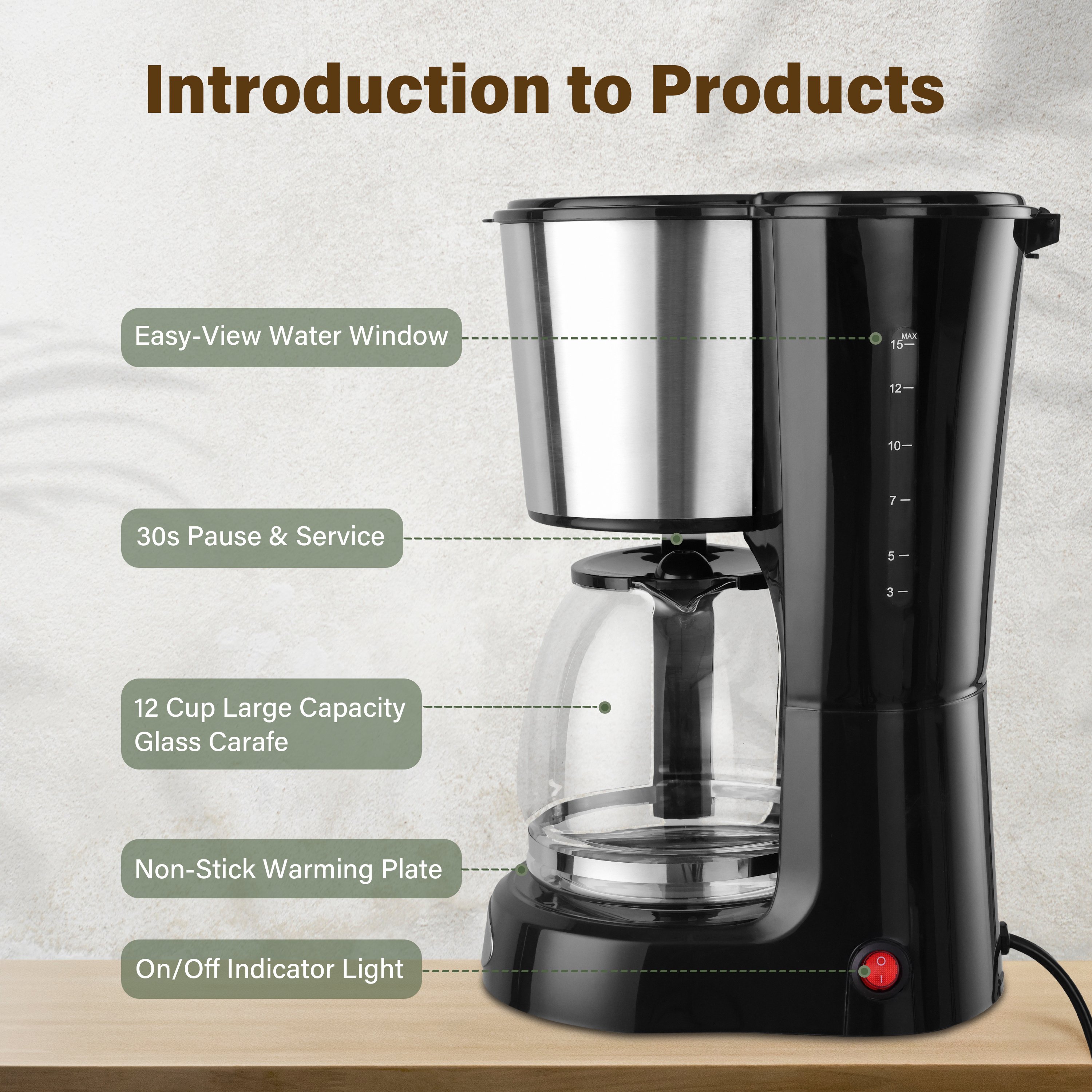 YSSOA Drip Coffee Maker 12 Cup, Anti-Drip Coffee Machine, Auto Keep Warm Function, Clear Water Level Window Coffee Pots, Small Coffee Makers Black, St