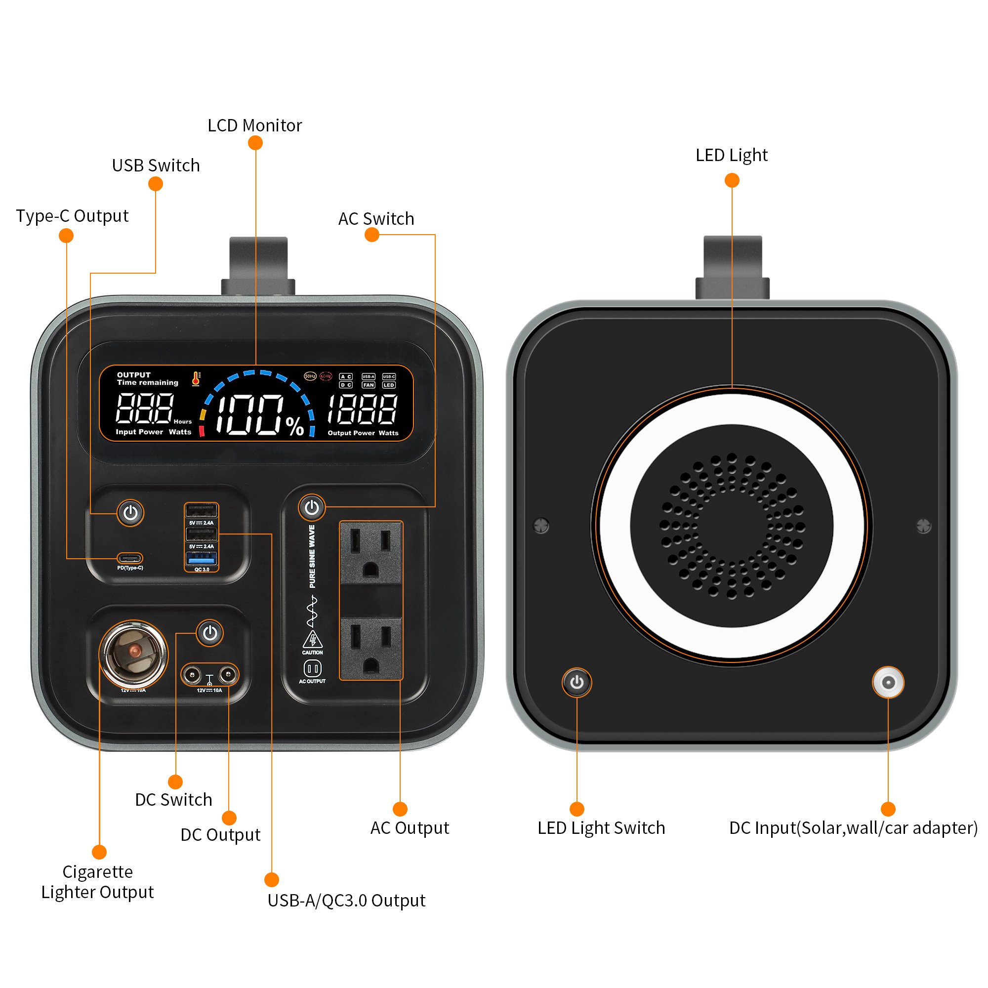 Gofort portable solar generator abolished the industrial-looking happened in traditional portable power station. Gofort UA portable power station adopted a simplicity style with rounded cuboid contour in fashion colored smooth pure aluminum housing; high brightness halo-like ring light and LCD high resolution screen; make it reliable to use and pleasant to look at.