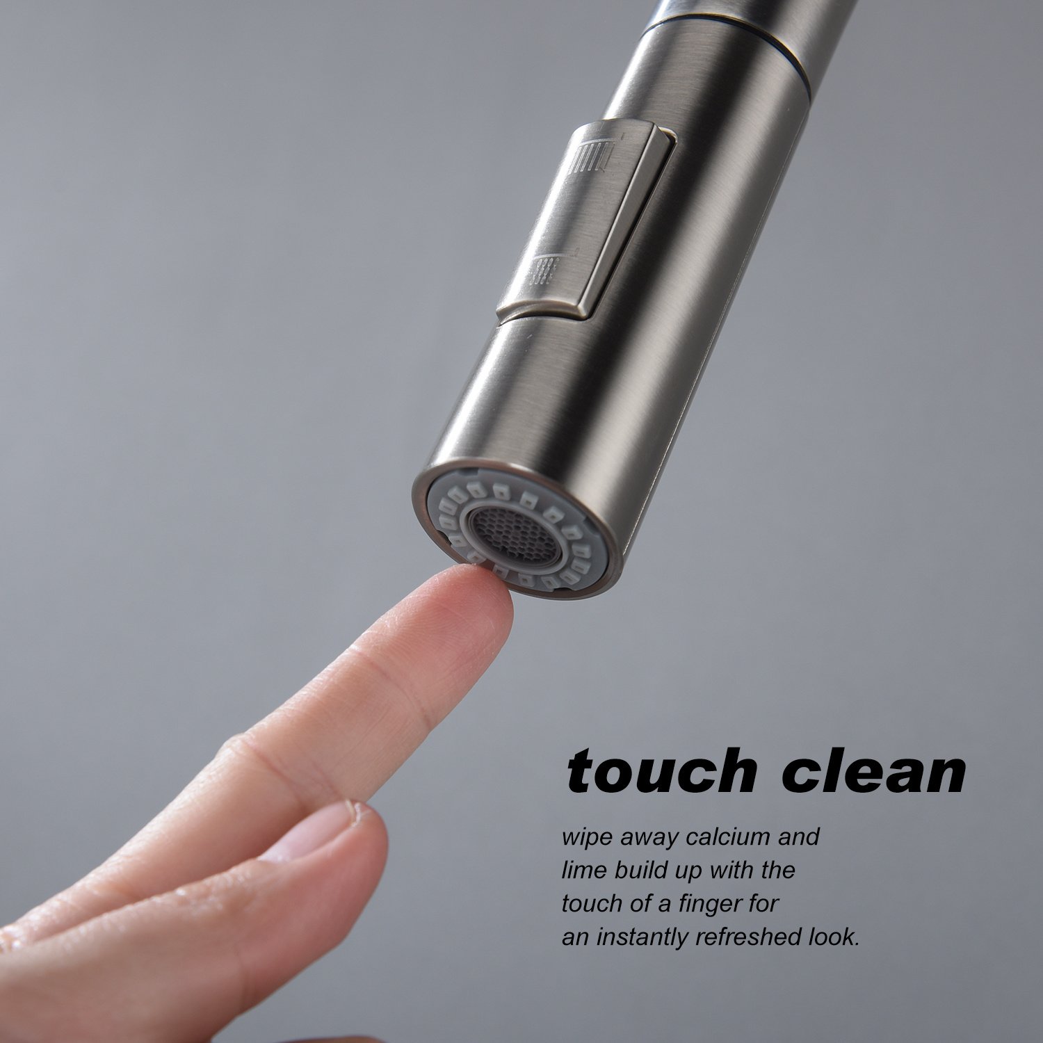 Dual mode setting Your kitchen faucet comes equipped with a pull down sprayer that; thanks to its hard rubber sprayer hole; provides a soft inflatable flow of water and a strong spray without splash.360 degree kitchen sink faucet sprayer.