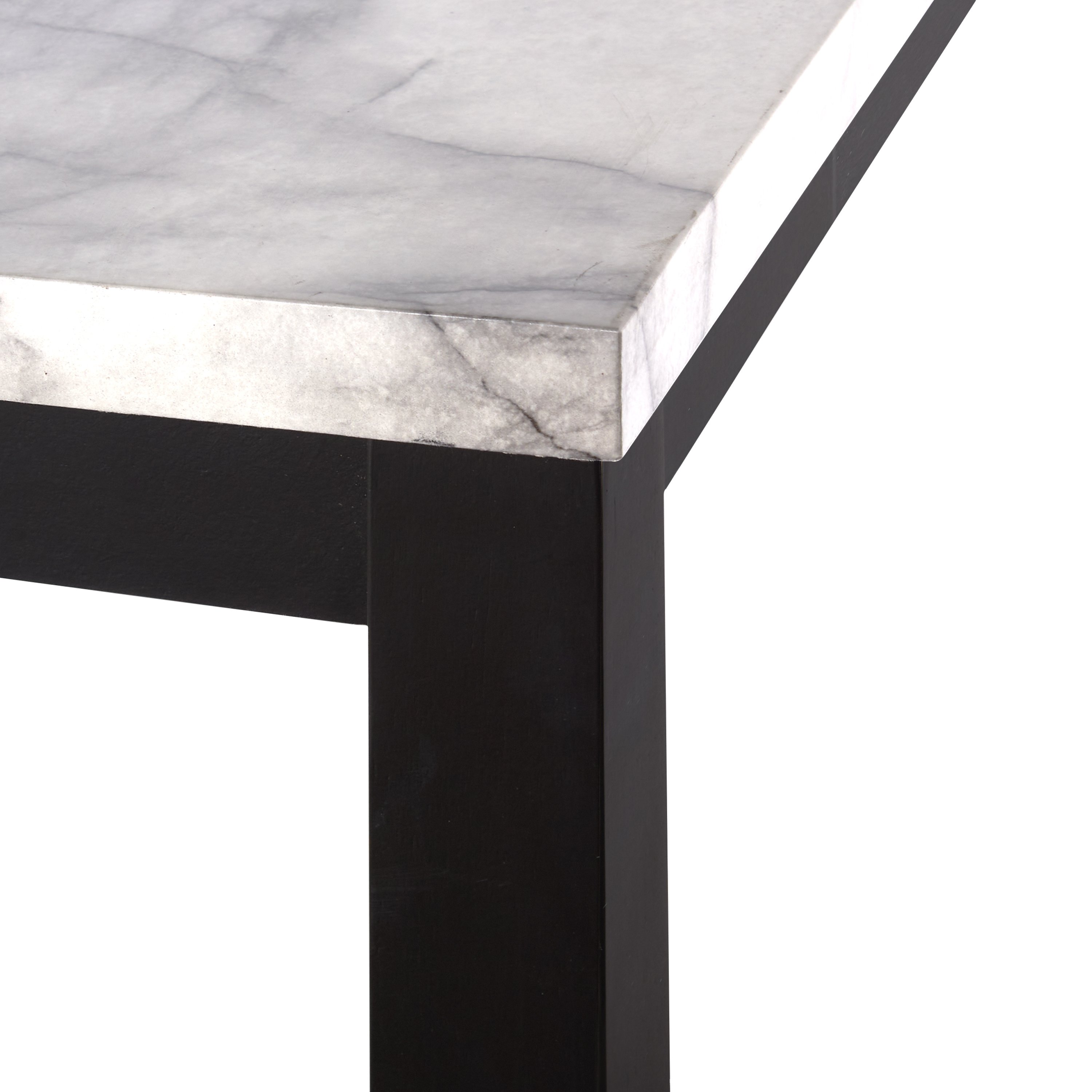 Reliable StabilityThe tabletop is reinforced with solid MDF with a thick slab of scratch resistant glossy marble patterned veneer on top. Solid rubber wood legs sealed in a protective lacquer provide sound support and sturdiness you can rely on without worry of wobbling.
