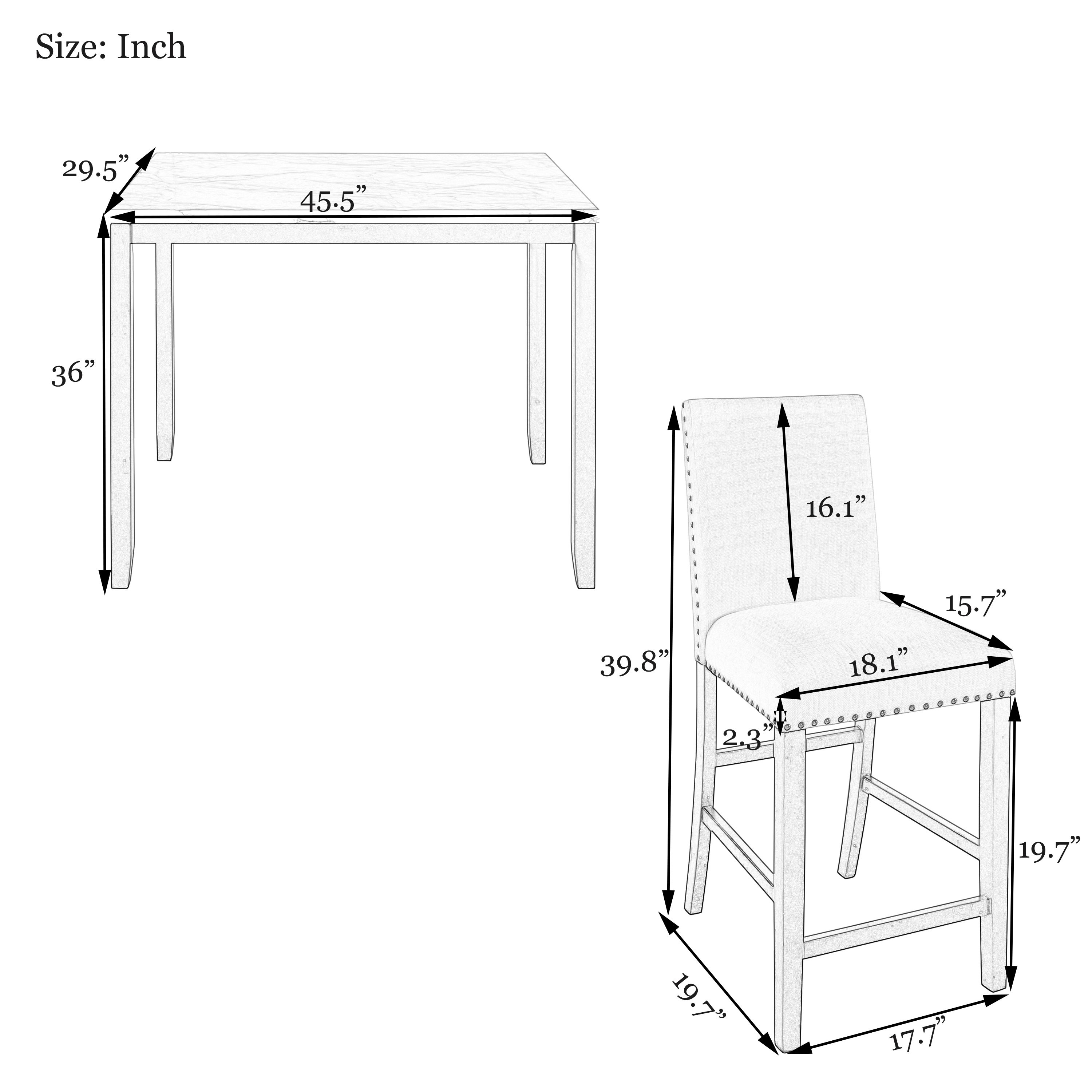 Upholstered SeatingThe beige fabric upholstered counter height chairs feature slightly curved back rests for ergonomic support while the seats are filled with plush fire-proof sponge allowing you to sit for extended periods of time in comfort.Weight&Dimensions&SpecificationsOverall Product DimensionTable:45.5x29.5x36inch; Chair: 17.7x19.7x39.8inchOverall WeightTable Net Weight:46.4lbs; Per Chair Net Weight: 13.3lbsWeight CapacityTable Weight Capacity: 250lbs; Per Chair Weight Capacity: 250lbsMaterialTable:MDF with marble veneer top; Rubber wood leg Chair: rubbe wood frame, Fabric seatPieces Included1table+4 chairsColorWhite marble veneer Table+ Beige ChairAssembly RequiredYesAdditional Tools RequiredAll Tools IncludedCountry of OriginVietnamProduct WarrantyPlease Read Return Policy