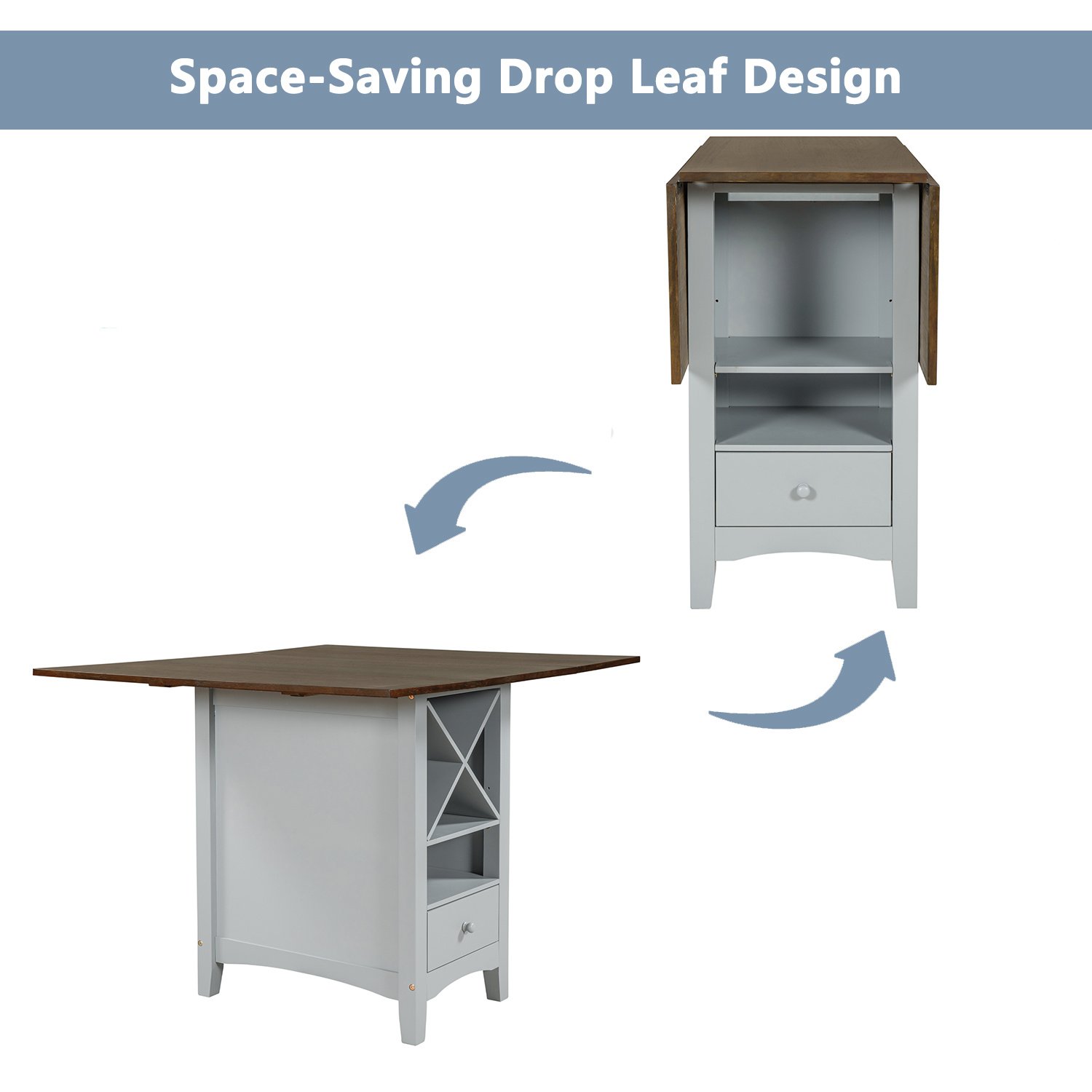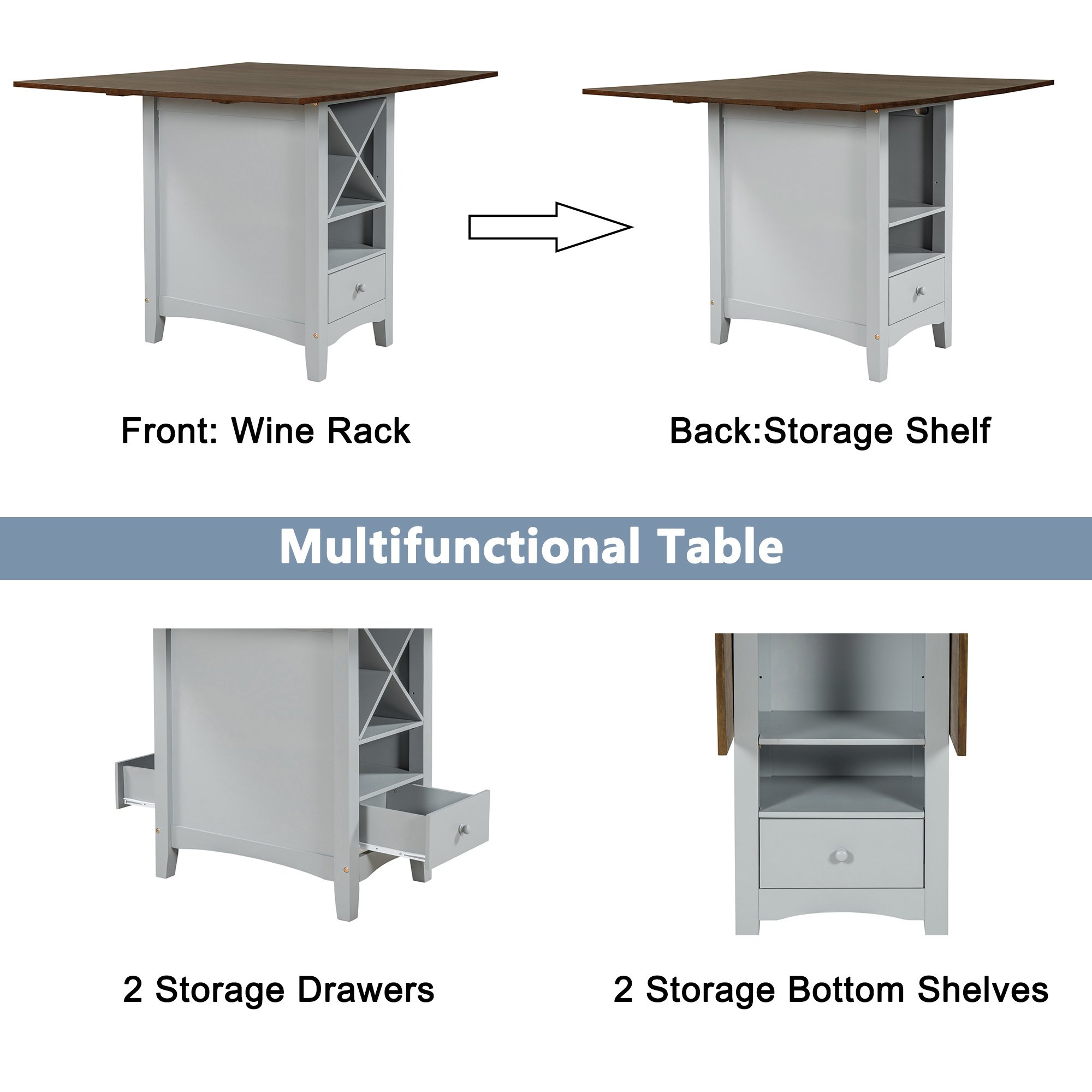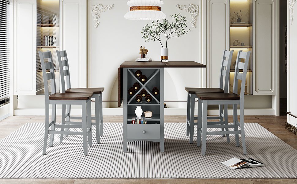 TOPMAX Farmhouse Wood Counter Height 5-Piece Dining Table Set with Drop Leaf, Kitchen Set with Wine Rack and Drawers for Small Places, Cherry+Gray