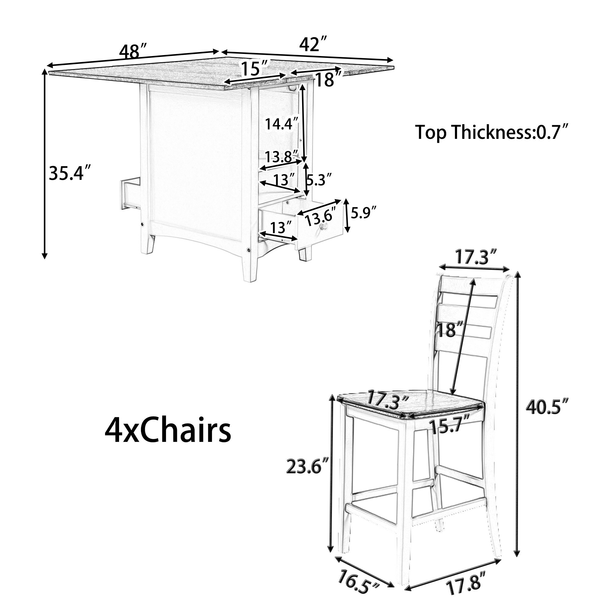 Counter Height Dining ChairsSit in comfort with these rustic ladder back side chair. Crafted of rubberwood, this chair features with 23.6inch counter height and footrest bars which offers great feelings for relaxation.Weight&Dimensions&SpecificationsOverall Product DimensionDining Table: (18-48)x42x35.4inch(LXWXH); Tabletop thickness:0.7inch; Drawer size:13.6x13x5.9inch(LXWXH); Dining Chair: 16.5x17.8x40.5inch(LXWXH); Seat Depth: 18inch; Seat to Floor: 23.6inchOverall WeightTable Net weight: 98.2 lbs; Per Chair Net Weight:16.5lbsWeight CapacityTable weight capacity: 300lbs; Each leaf:50lbs; Each Shelf:40lbs; Each Drawer:40lbs; Wine Rack:40lbs; Per Dining Chair:250lbsMaterialTable/Chair top: MDF Table/Chair legs: rubber woodPieces Included1 table+4 chairColorCherry+GrayAssembly RequiredYesAdditional Tools RequiredAll Tools IncludedCountry of OriginVietnamProduct WarrantyPlease Read Return Policy