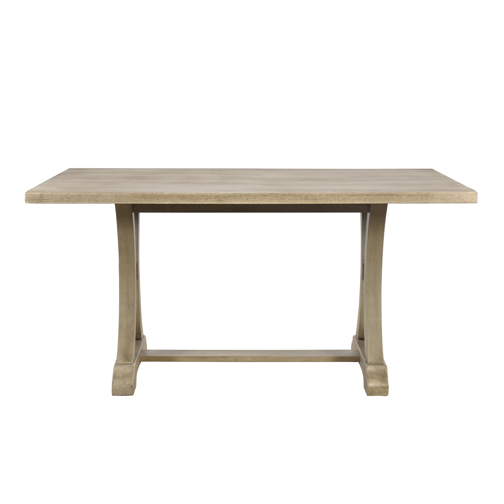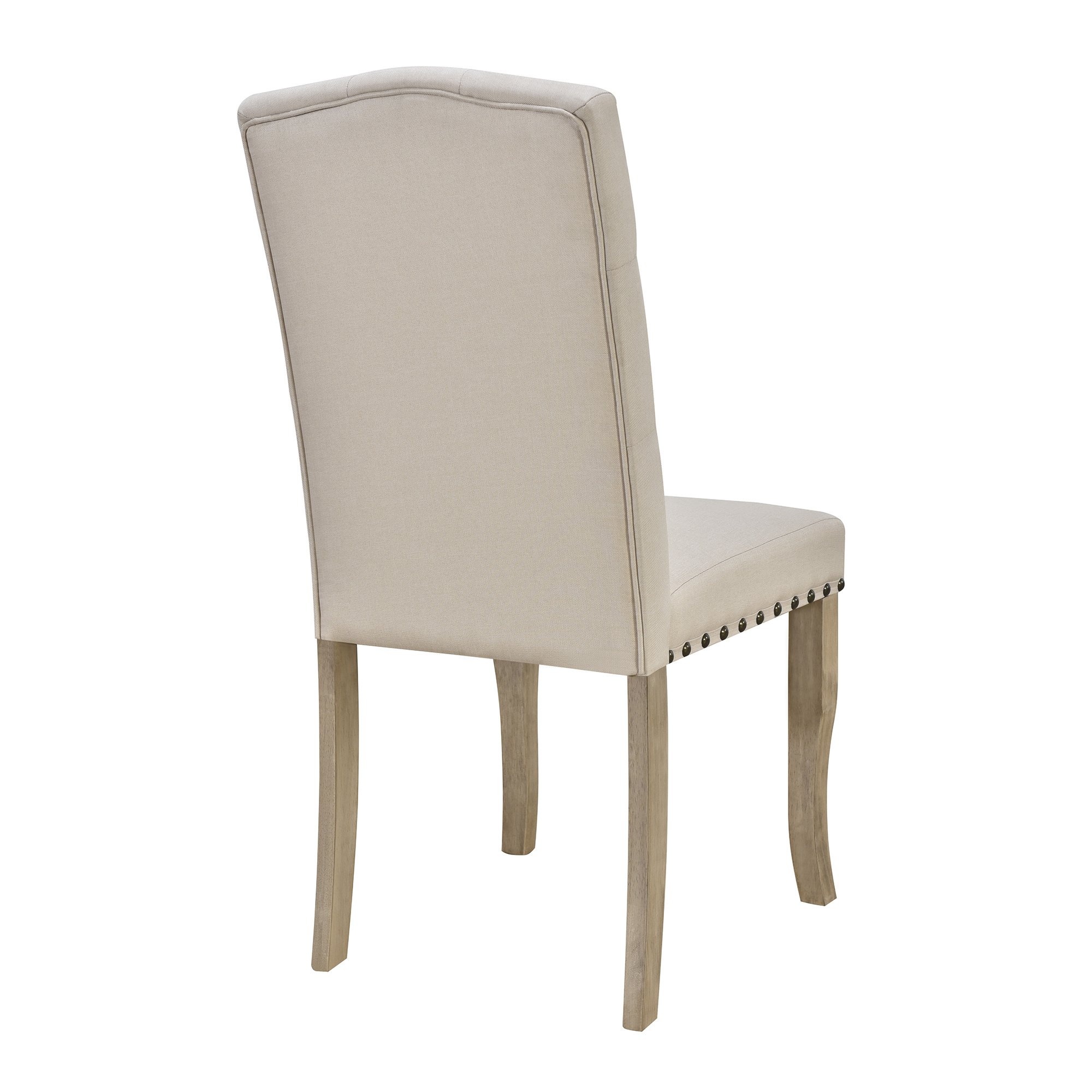 The curved trestle-shaped table legs demonstrate a unique aesthetic feeling, showing the soft and elegant effect of American style. The backrests of the chairs are ornamented with tufted buttons that form an elegant argyle pattern. With nailhead decoration around the side of the upholstered chair cushions, this rustic dining table set makes an impact on the modern and contemporary style. These delicate details can make the dining set less homogeneous and more distinctive.